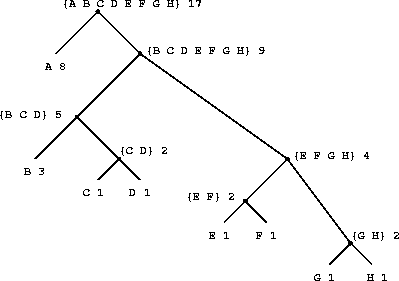 | Initial leaves | {(A 8) (B 3) (C 1) (D 1) (E 1) (F 1) (G 1) (H 1)} |