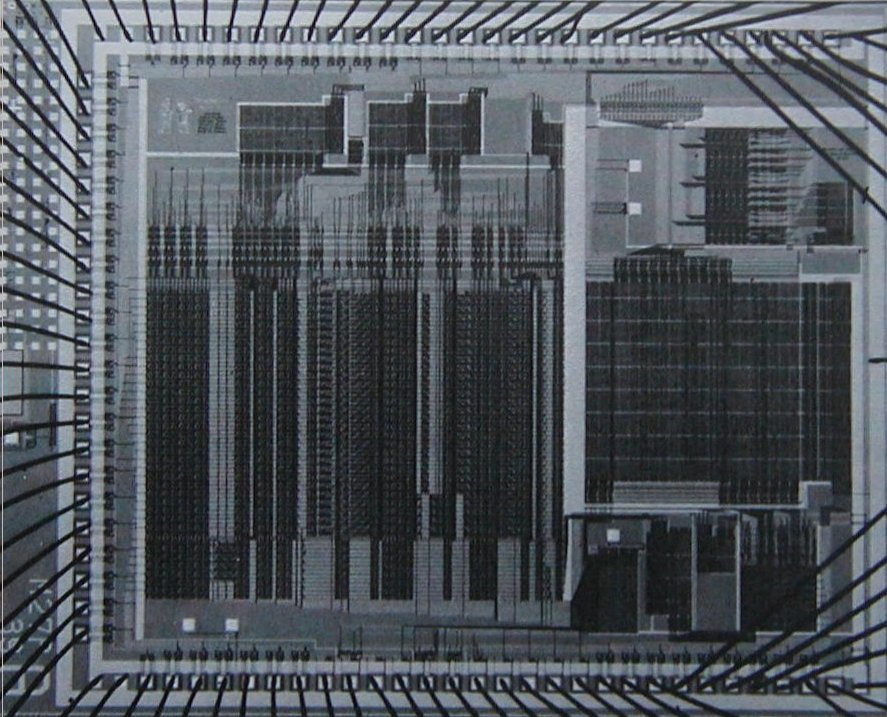 In section 5.1 we saw how to transform simple Scheme programs into descriptions of register machines. We will now perform this transformation on a more complex program, the metacircular evaluator of sections 4.1.1-4.1.4, which shows how the behavior of a Scheme interpreter can be described in terms of the procedures eval and apply. The explicit-control evaluator that we develop in this section shows how the underlying procedure-calling and argument-passing mechanisms used in the evaluation process can be described in terms of operations on registers and stacks. In addition, the explicit-control evaluator can serve as an implementation of a Scheme interpreter, written in a language that is very similar to the native machine language of conventional computers. The evaluator can be executed by the register-machine simulator of section 5.2. Alternatively, it can be used as a starting point for building a machine-language implementation of a Scheme evaluator, or even a special-purpose machine for evaluating Scheme expressions. Figure 5.16 shows such a hardware implementation: a silicon chip that acts as an evaluator for Scheme. The chip designers started with the data-path and controller specifications for a register machine similar to the evaluator described in this section and used design automation programs to construct the integrated-circuit layout.noteSee Batali et al. 1982 for more information on the chip and the method by which it was designed.